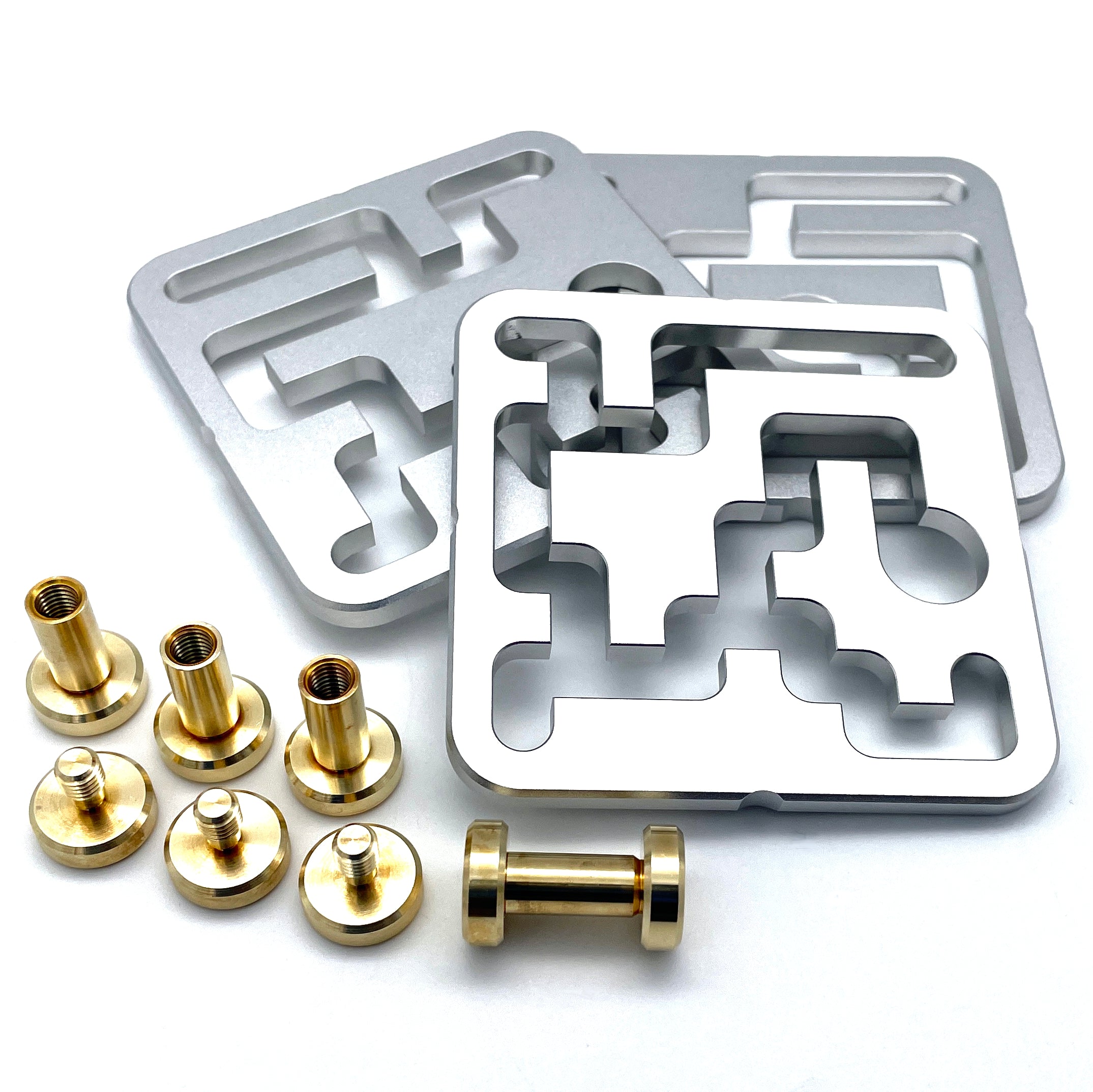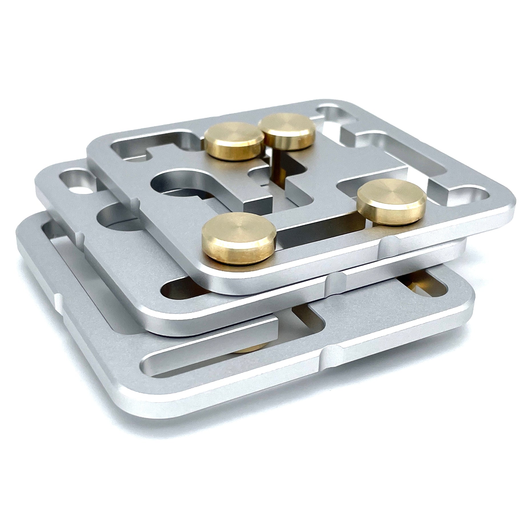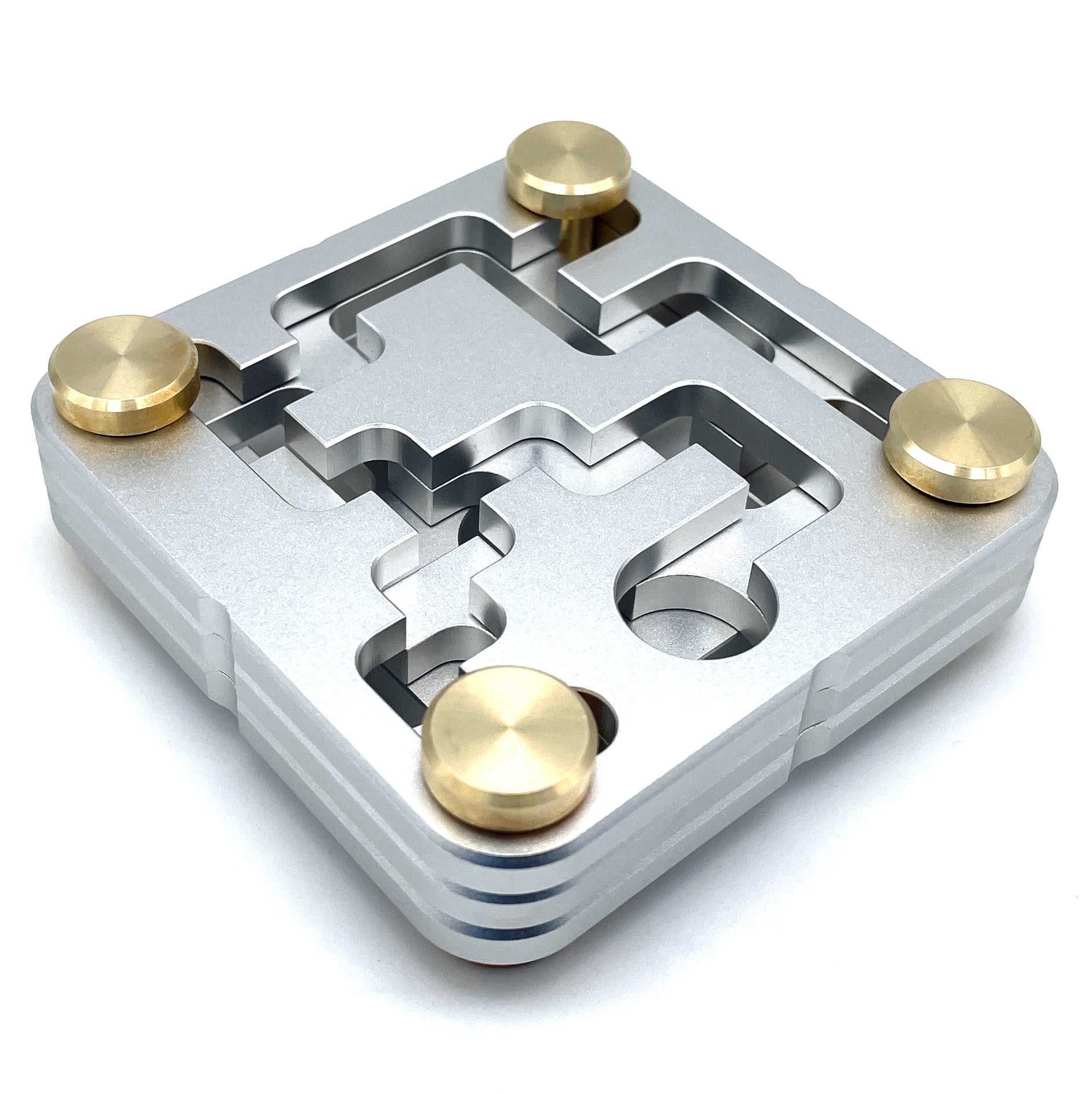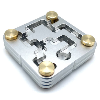 FastMaze 1 is precision crafted from machined aluminum and solid brass. The puzzle does not show any laser cutting marks as cheaper metal puzzles often do. Each piece was custom milled, and the attention to detail is apparent. Every maze edge is micro-chamfered for a smooth feel and easy movement. The plates are finished with fine sandblasting, similar to high-end electronic goods, and are clear anodized which makes them scratch and tarnish resistant. The tight tolerances guarantee smooth movement and make it a joy to pick up and play.