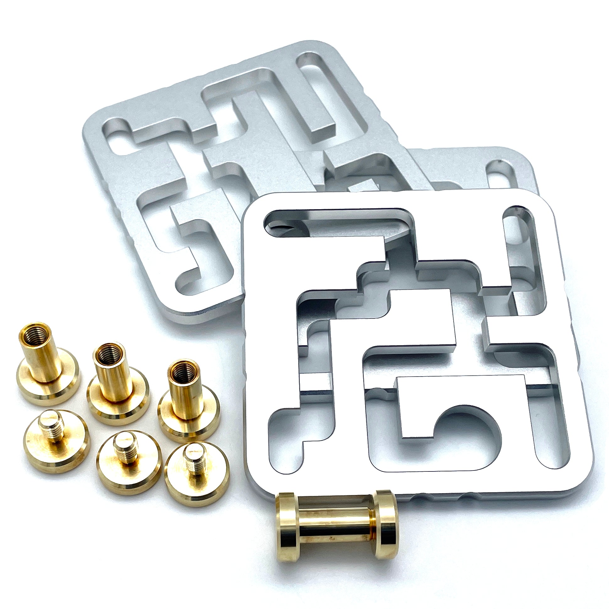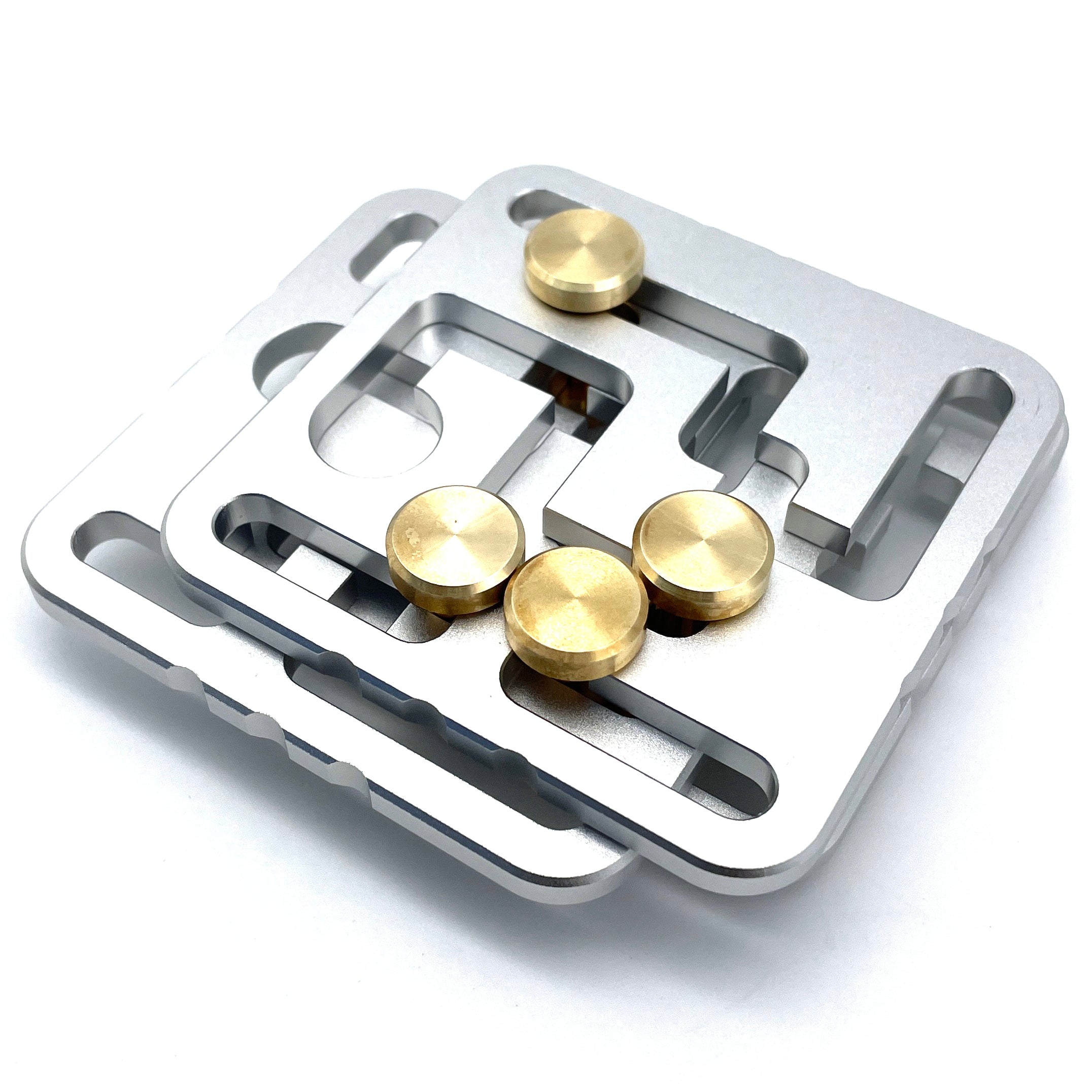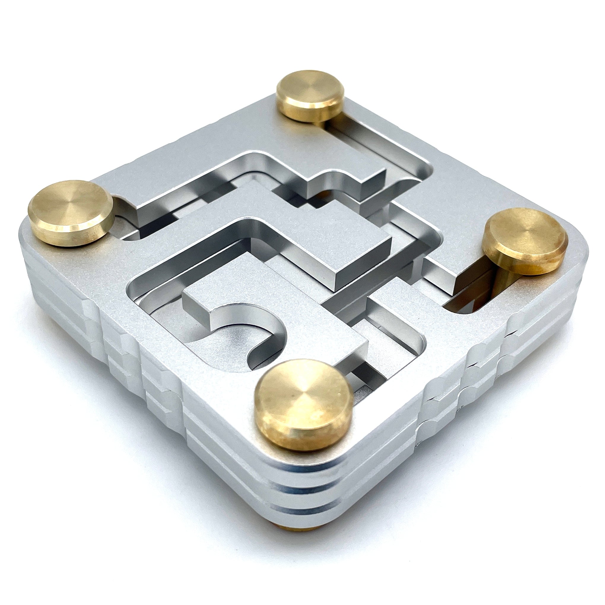 FastMaze 3 is precision crafted from machined aluminum and solid brass. The puzzle does not show any laser cutting marks as cheaper metal puzzles often do. Each piece was custom milled, and the attention to detail is apparent. Every maze edge is micro-chamfered for a smooth feel and easy movement. The plates are finished with fine sandblasting, similar to high-end electronic goods, and are clear anodized which makes them scratch and tarnish resistant. The tight tolerances guarantee smooth movement and make it a joy to pick up and play.